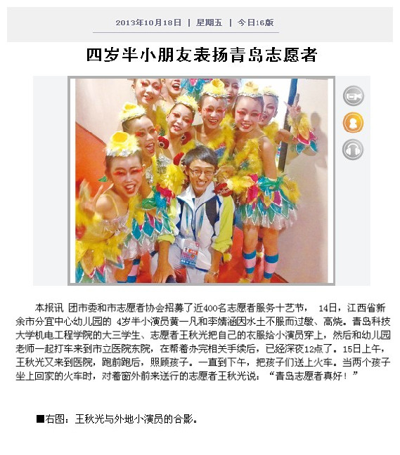 11月13日上午,电子游戏推荐 分团委收到一封来自青岛港中旅(山东)旅行社有限公司的感谢信,信中表达了对电子游戏推荐官网学生机自114班任建桥同学服务第十届中国艺术节的感谢。
