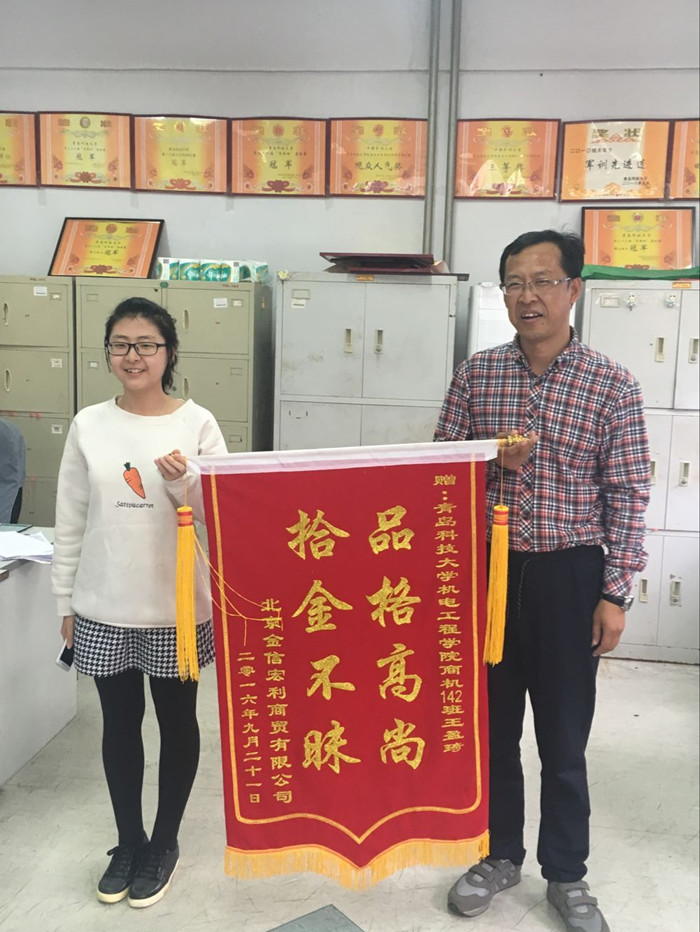 10月13日下午,电子游戏推荐 收到了北京金信宏利商贸有限公司李金菊赠送的一面锦旗,锦旗上写着“品格高尚,拾金不昧”。