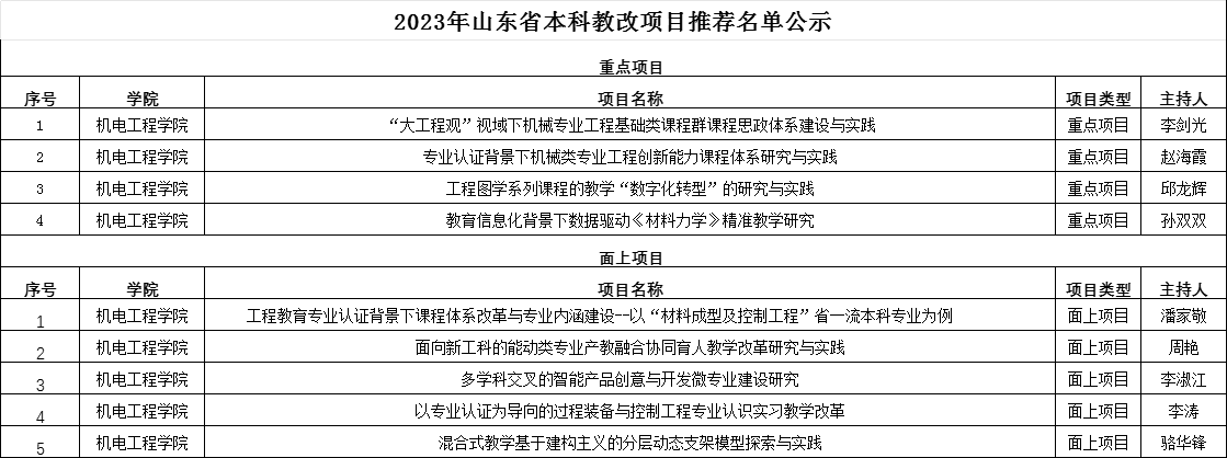 根据学校《关于组织开展2023年山东省本科教学改革研究项目立项申报和管理工作的通知》要求,电子游戏推荐 组织开展了省级教改项目申报工作,经项目负责人个人申报,校内专家评审,共拟推荐重点项目4项,面上项目5项,至学校,进行下一步评审。现将结果公示如下: