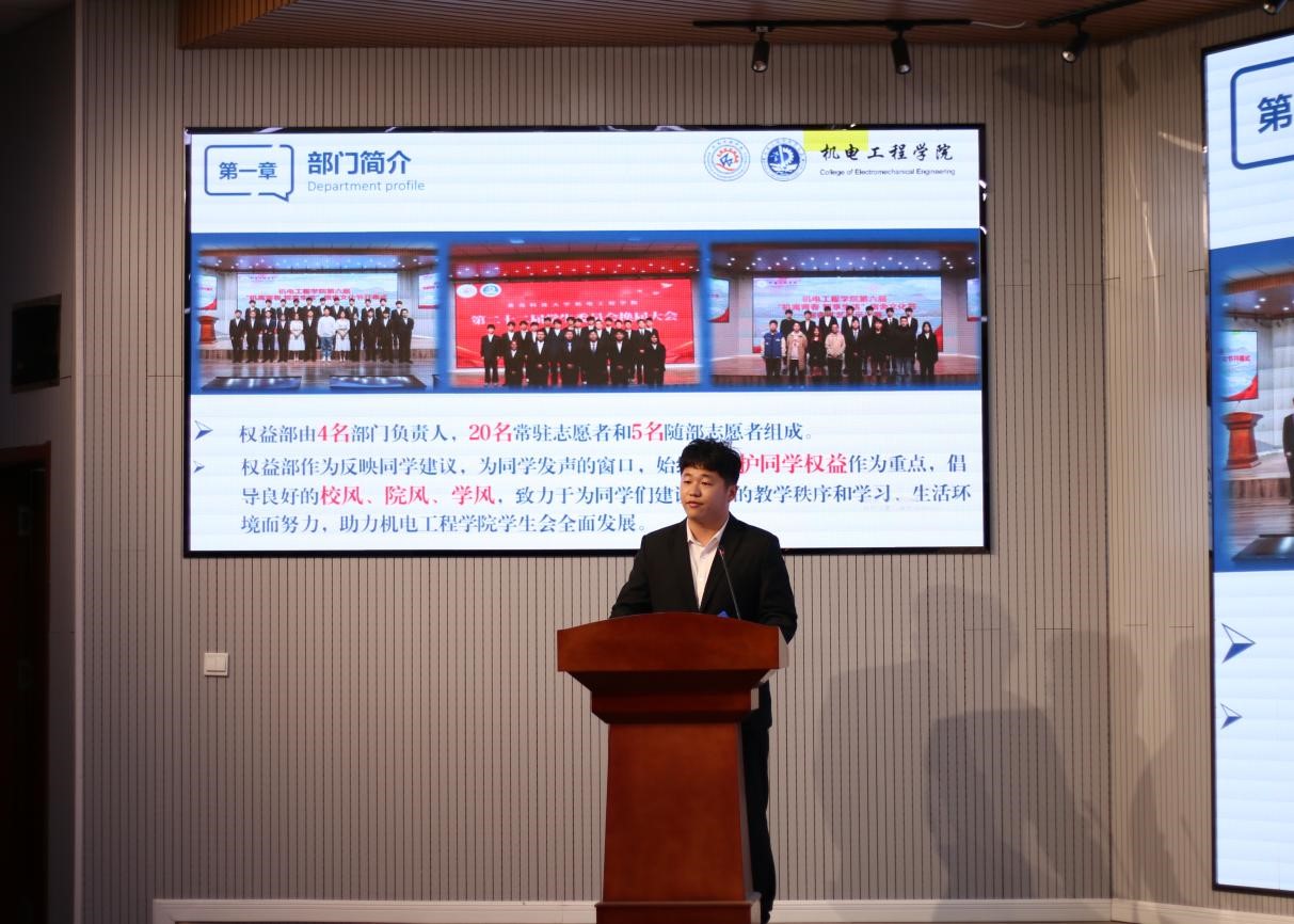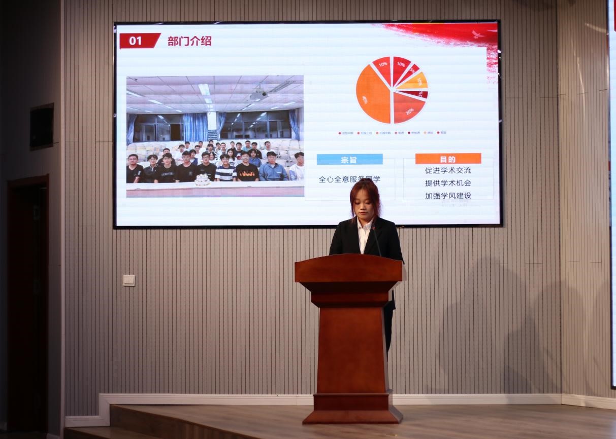 学生会的工作开展情况,各部门负责人针对各部的工作情况面向学生会全体成员和老师进行学期工作汇报。