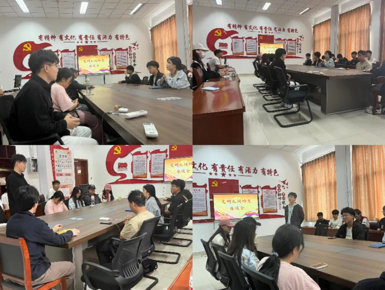 组织举办文明礼仪师生座谈会,邀请学校相关部门负责人、文明礼仪方面专家、辅导员及学生代表参加,重点围绕校园不文明行为的现状及解决措施,大学生文明礼仪教育及日常行为规范等畅所欲言、建言献策,凝聚思想共识。
