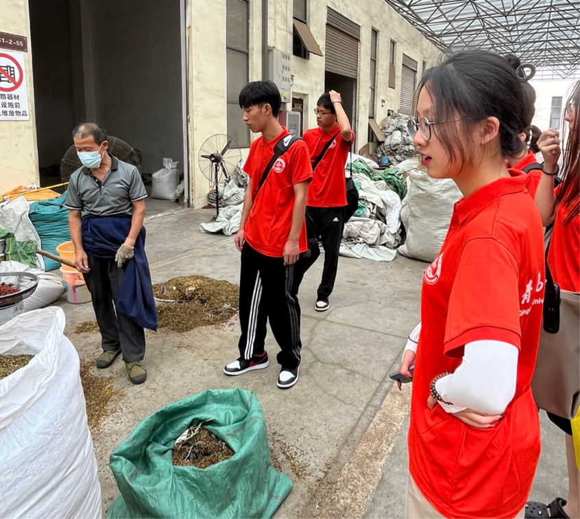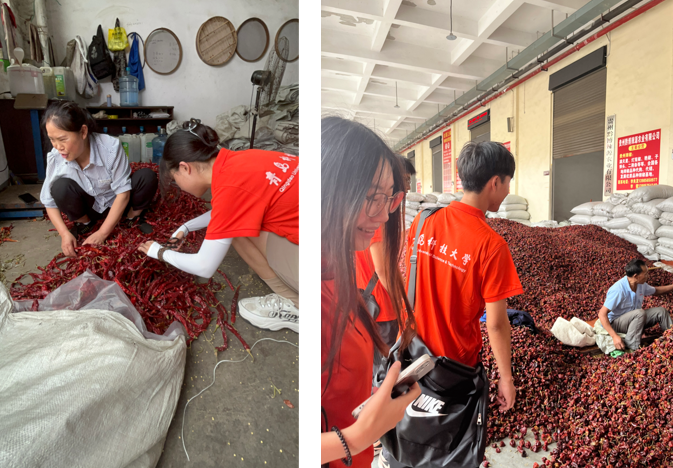 调研团进入企业工厂内部进行参观、体验、学习。刚走近工厂,一股辣椒的辛香味扑面而来,随处可见的是堆放在一起的辣椒,出现在这里的辣椒种类繁多。在农民工人的指引下,调研团的成员们纷纷上前去体验辣椒的初步加工工作。