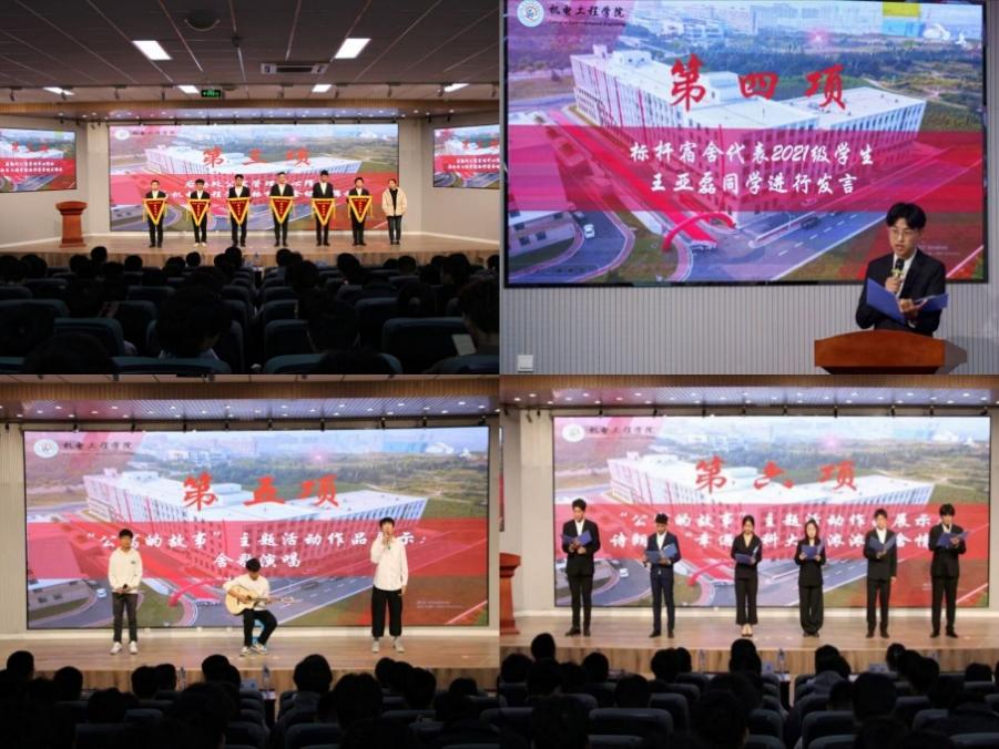 2021级优秀宿舍学生代表王亚磊发言,进行“公寓的故事”优秀作品舍歌演唱以及诗朗诵“幸遇青科大,浓浓宿舍情”。