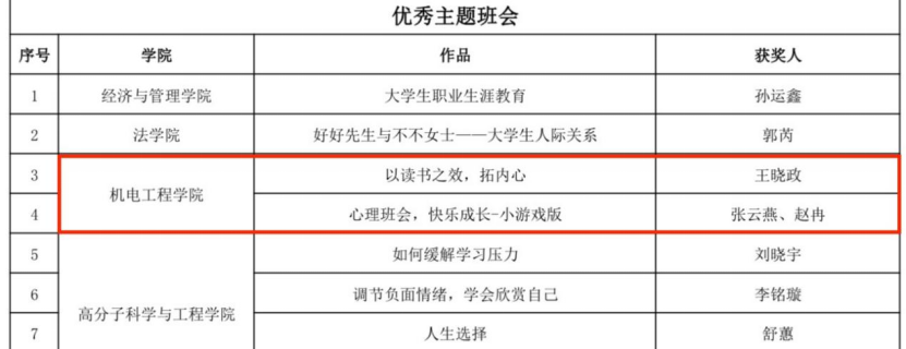 《“小卷的人生翻盘”剧本杀团辅活动》获评心理健康教育特色活动;由王晓政提报的《以读书之效,拓内心》和由张云燕、赵冉提报的《心理班会,快乐成长-小游戏版》获评“优秀主题班会”;由郑成瑞提报的《足够》和张云燕提报的《希望》获评“三行诗优秀创作奖”。
