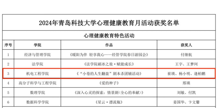 为扎实做好心理健康教育工作,全面提升心理育人质量,着力培育学生自尊自信、理性平和、积极向上的健康心态,按照山东省相关通知要求,学校举办了2024年青岛科技大学心理健康教育月评选展示活动,发布了《2024年青岛科技大学心理健康教育月活动获奖名单》,电子游戏推荐