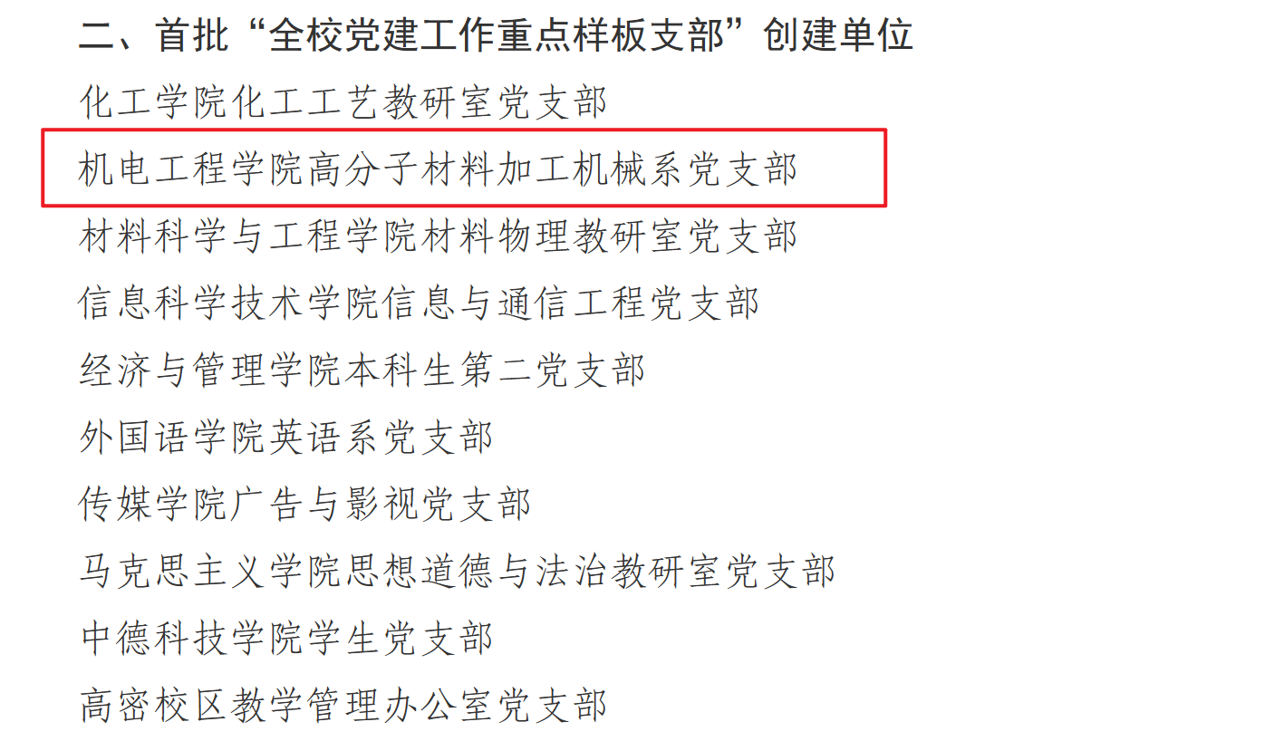 党委荣获多项佳绩,其中,学院党委入选首批“全校党建工作标杆院系”创建单位,高分子材料加工机械系党支部入选首批“全校党建工作重点样板支部”创建单位,机械工程及自动化系党支部书记工作室入选首批“全校‘双带头人’教师党支部书记工作室”创建单位,2022级硕士研究生张晓楠入选首批“全校研究生党员标兵”。