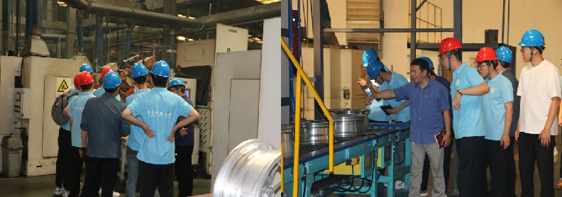 实践团一行人来到威海万丰奥威汽轮有限公司后,在技术经理徐福孙带领下调研团师生参观了公司厂房,一同观看了轮毂模型铸造、热处理、机械加工、表面处理、质量检测与包装。参观期间,技术经理徐福孙认真回答前来参观交流实践团成员的提问,让大家深入了解轮毂的制作工艺。