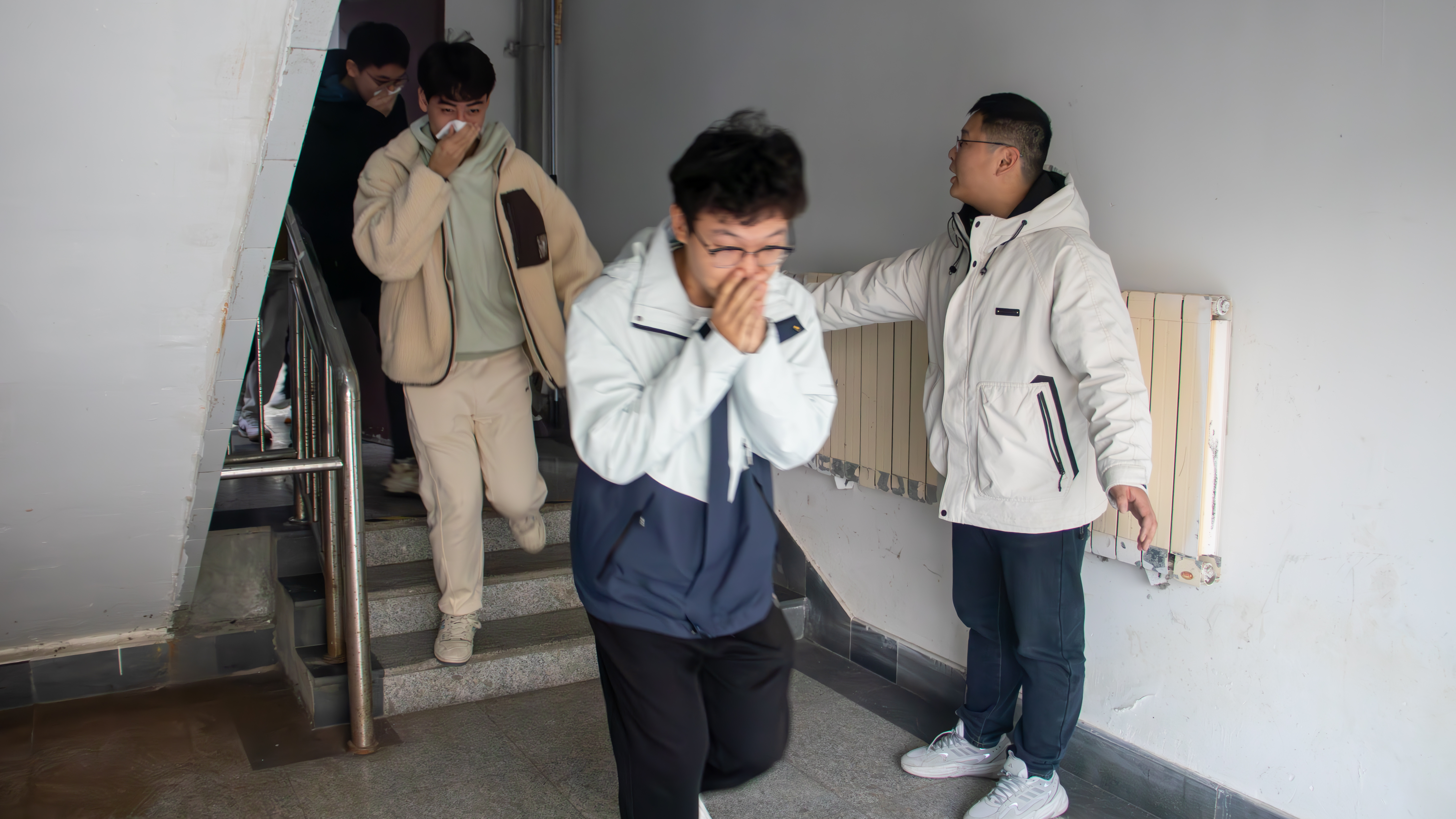 随后,在崂山校区北2舍、北3舍开展了消防疏散演练。警报声响起,同学们迅速反应,按照培训要求,用湿毛巾捂住口鼻、弯腰前行,沿预定路线迅速而有序地撤离到安全区域。疏散过程中秩序井然,到达集合点后,各宿舍立即点名确认,班长核实全员安全撤离并上报情况。