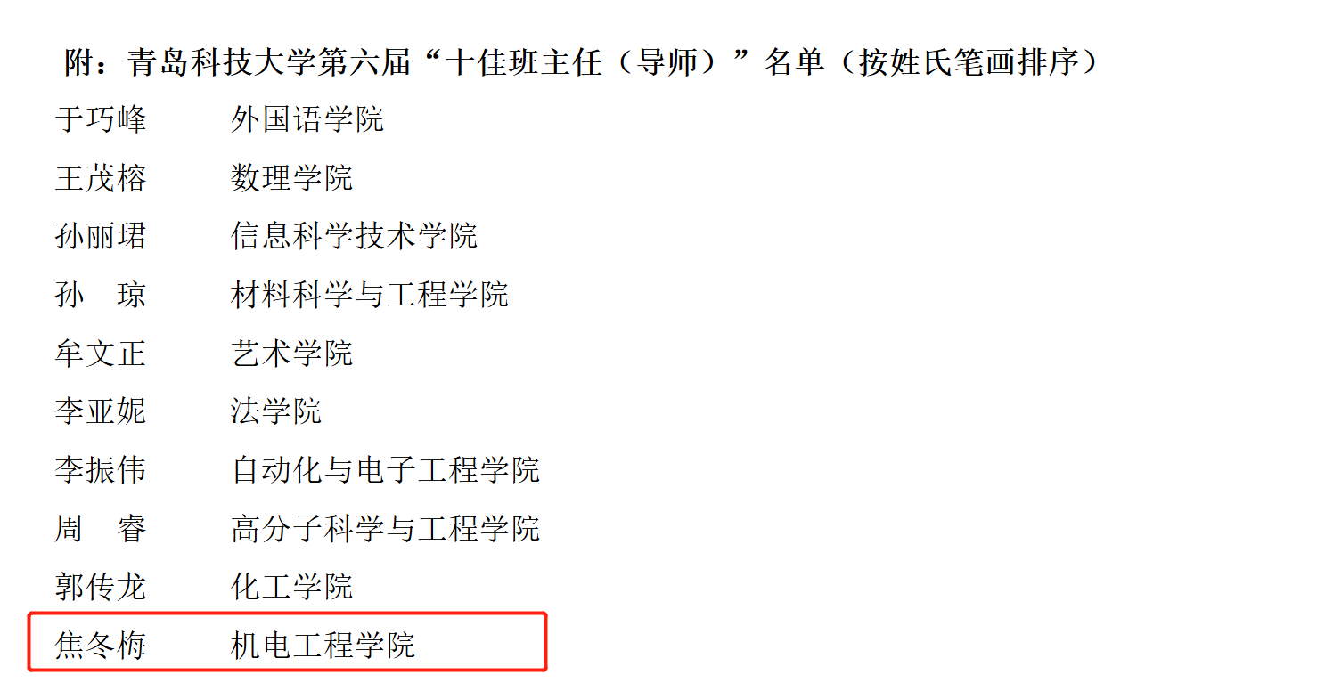 据悉,根据《青岛科技大学十佳班主任(导师)评选办法》(青科大学字﹝2014﹞30号),学校组织开展了第六届“十佳班主任(导师)”评选。经过学院(校区)推荐、学校审核、学生评议、网络投票和评审委员会投票等环节,拟确定焦冬梅等10名班主任(导师)为青岛科技大学第六届“十佳班主任(导师)”。