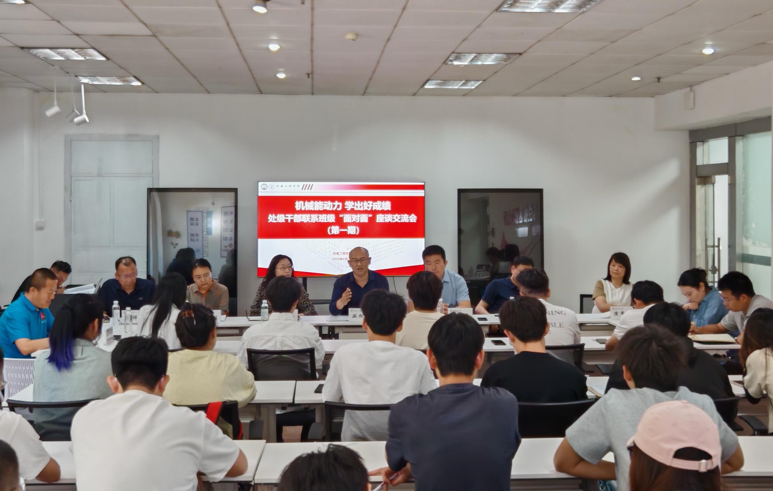 在校一站式社区组织“机械能动力、学出好成绩”处级干部联系班级“面对面”座谈交流会(第一期)。校离退休工作处处长丛松涛、国际交流与合作处处长陈兵、党委统战部副部长魏琳、纪委监察专员办公室王豫凌、侯雯雯、孟祥军、李佳,学院2023级辅导员杜康、崔瑛,班主任代表潘弋人,2023级班长、团支书参加会议,会议由学院党委副书记兼副院长杨小明主持。