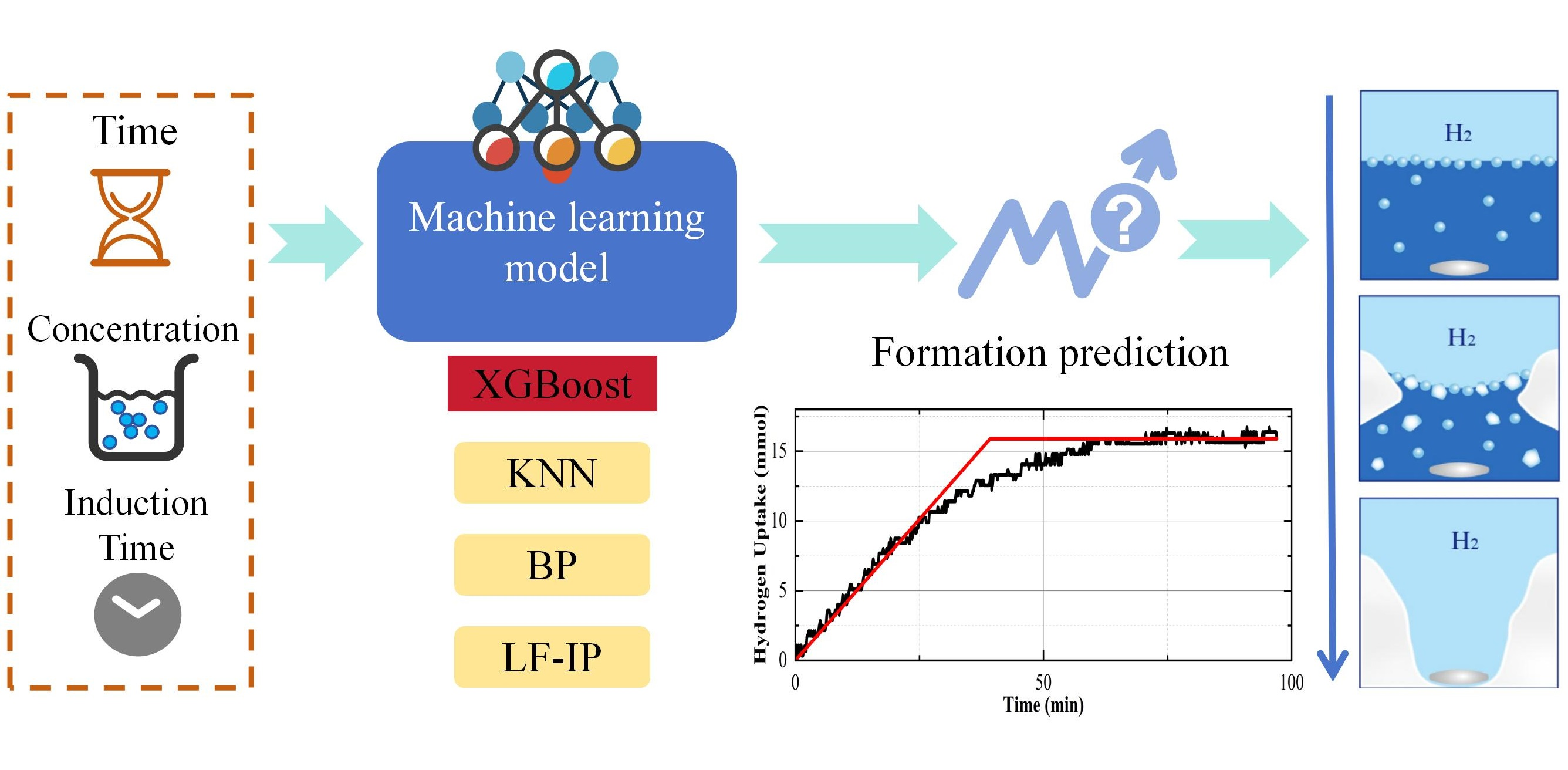 水合物被视为新型储氢材料,基于水合物的固态储氢技术将成为打开氢经济成功之门的关键钥匙,弥补氢气生产与应用之间的鸿沟。虽然该技术可实现温和条件下的突破性储氢,但高昂的实验成本阻碍了对氢气水合物生成机制的理解和强化策略的开发。精确预测氢气水合物的生成虽至关重要,却受限于氢气水合物生成固有的强烈随机性。该研究采用数据驱动的机器学习方法进行了氢气水合物生成预测,并利用训练好的模型,实现了氢气水合物生成实验设计,进而揭示了氢气水合物生成内在机制。结果表明,XGBoost算法在氢气水合物整个生成周期中具有卓越的预测精度,六组验证实验证实了其出色的泛化能力,预测的最终储氢量平均相对误差仅为5.0%。基于XGBoost指导的设计实验,建立了水合效率相图,刻画了水合物稳定/非稳定区域,进而提出了氢气水合物生成对传质模式(气-液与气-固)的依赖关系:气-液传质是强化氢气水合物生长的最有效模式,而传质模式从气-液向气-固的转变会显著恶化水合效率。