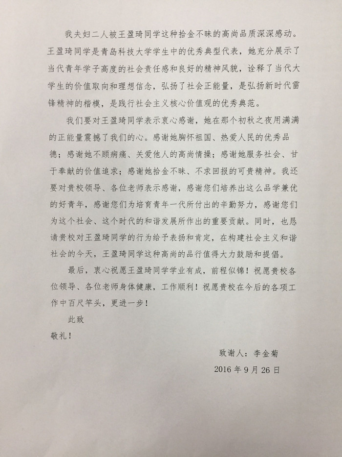 据了解,王盈琦平时是一个做事低调,富有责任心、乐于助人的人。她拾金不昧的行为,反映了学校学生良好的道德情操和社会责任感,是学校思想道德培养成果的一个缩影,她的高尚行为在校园里树立了良好的榜样。
