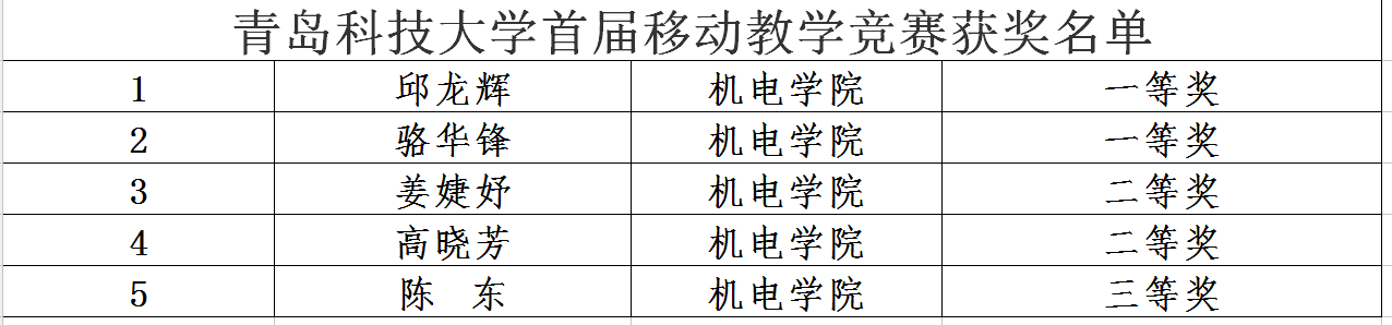 据悉,根据教育部《教育信息化2.0行动计划》和我校《关于开展青岛科技大学首届移动教学竞赛的通知》,为了推广课程教学信息化建设,提高师生信息化应用水平和信息素养,建设“互联网+教育”课程平台,推动信息化教学从融合应用向创新发展转变,激励教师改革课堂教学模式,学校开展了首届移动教学竞赛评审。综合教学过程实践考核和现场教学表现,共评出获奖教师25名,其中一等奖5名,二等奖9名,三等奖11名,现将获奖名单如下: