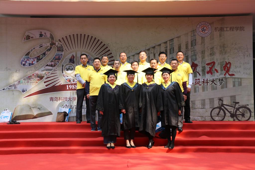最后,与会领导与穿着学士服的橡机、化机专业的88届校友们合影留念。