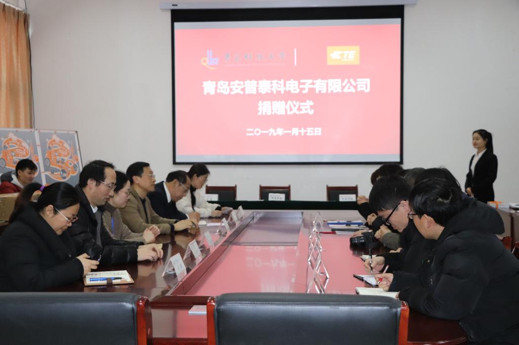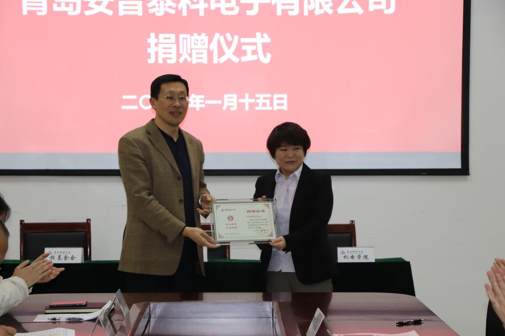 1月15日上午,青岛安普泰科电子有限公司捐赠仪式在机电大楼518会议室隆重举行。校友办主任兼教育发展基金会秘书长聂广明、电子游戏推荐