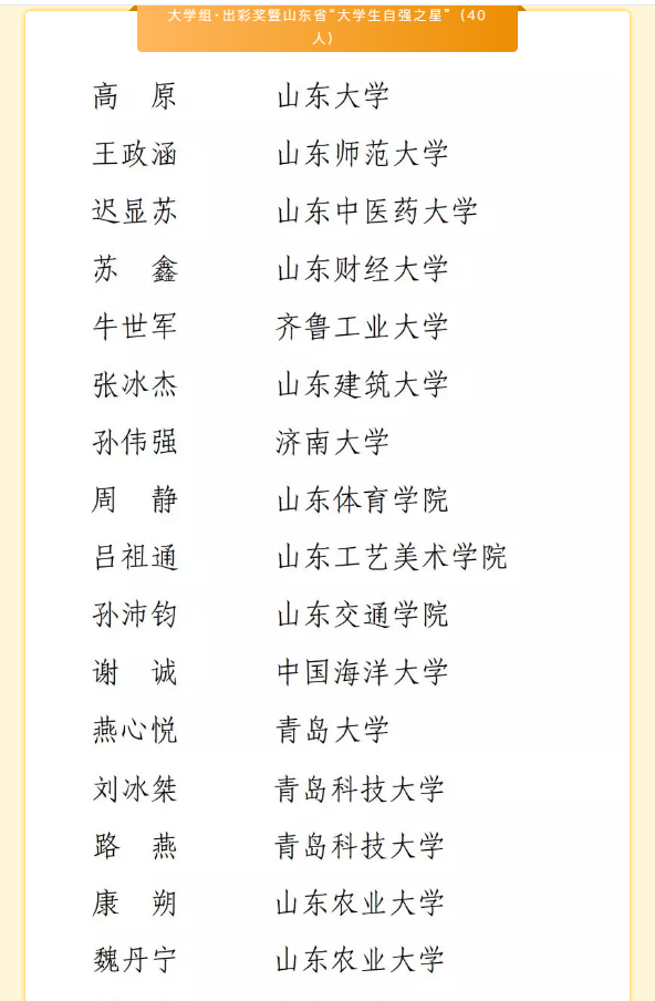 近日,在山东省学生联合会公布的2019年“大智之星”齐鲁学子奖学金获奖名单公示中,电子游戏推荐官网学子刘冰桀荣获大学组--出彩奖暨山东省“大学生自强之星”。