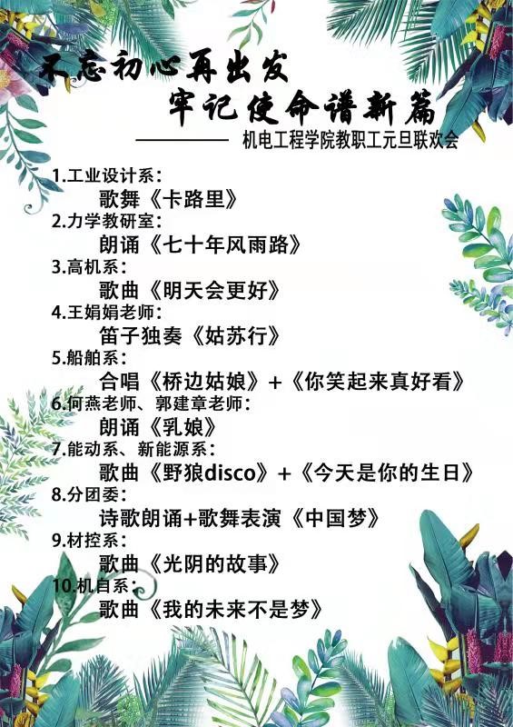 文艺汇演暨2020元旦联欢会在工业设计系师生表演的歌舞《卡路里》中拉开序幕。力学教研室的诗朗诵《七十年风雨路》歌颂了祖国70年的辉煌成就,高机系的《明天会更好》表达了机电全体老师对学校、对学院的美好祝福。何燕和郭建章两位院长的朗诵《乳娘》将联欢会推向了高潮。分团委的《中国梦》以歌曲、舞蹈、新闻主持、现场报道相互交融的新颖独特方式将分团委一年来辛勤的工作和取得成绩呈现给每位老师,引起了一阵阵热烈的掌声。王娟娟老师笛子独奏《姑苏行》,船舶系的小合唱《桥边姑娘》和《你笑起来真好看》、能动系、新能源系的歌舞《野狼disco》和《今天是你的生日》、材控系的小合唱《光阴的故事》、机自系的小合唱《我的未来不是梦》,一首首动听的乐曲,一段段优美的旋律,展现了各教研室老师的多才多艺,活力迸射的精神面貌。