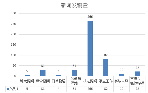 一年来,学院坚持讲好机电故事,发好机电声音。全年共发新闻超400篇,其中科大要闻5篇, 综合新闻31篇。日常投稿4篇,“不忘初心、牢记使命”主题教育投稿31篇。学院网站机电266篇,学生工作82篇。学生处网站学院传真投稿12篇。新工科、王跃熙、暑期社会实践等获得市级及以上媒体报道22次。