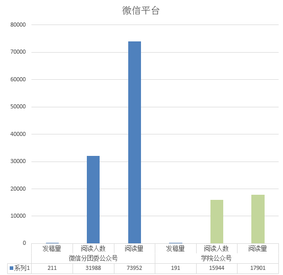 微信平台学院公众号发191篇,阅读人数15944人次,阅读量17901次;分团委公众号,发稿211篇,阅读人数31988人次,阅读量73952次。QQ空间共发126篇,阅读量1015111次。