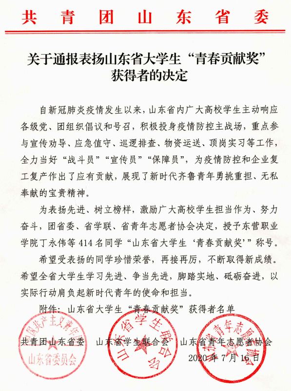 近日,在共青团山东省委公布的《关于通报表扬山东省大学生“青春贡献奖”获得者的决定》中,电子游戏推荐官网罗浩宇同学荣获山东省大学生“青春贡献奖”。