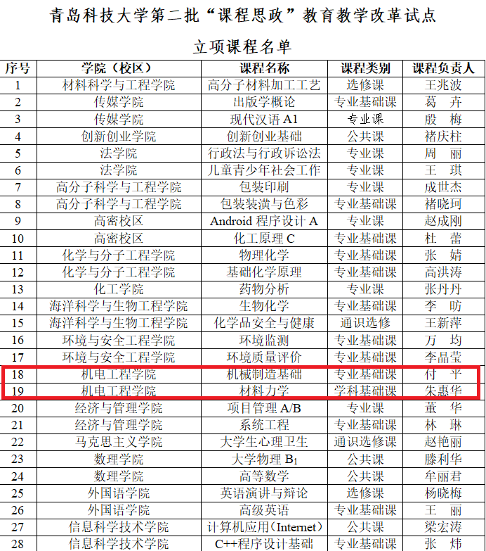 近日,在学校公布的青岛科技大学第二批“课程思政”教育教学改革试点立项课程的通知中,电子游戏推荐官网付平老师的《机械制造基础》与朱惠华老师的《材料力学》两门课程荣获立项。