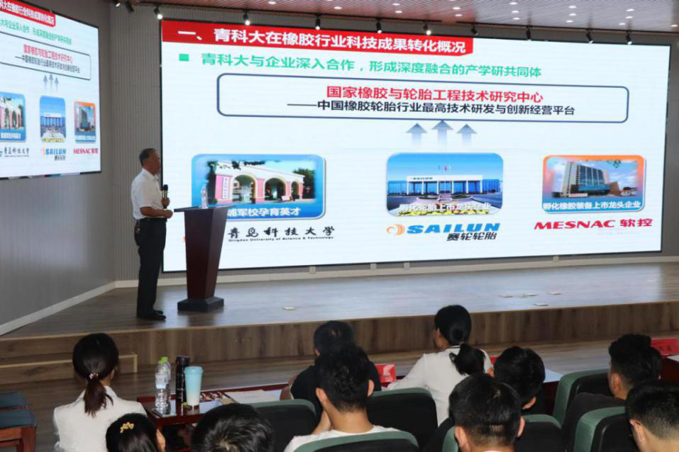 第十一届研究生学术论坛”的活动安排。路建平作了题为《青科大在橡胶轮胎产业链下的技术创新与发展》的分享,讲述了橡胶产业的“前世今生”,并指出了当今橡胶产业存在的机遇与挑战,并对研究生们提出了三点建议,一是要立志高远,勇于担当;二是要求真务实,脚踏实地;三是要树立自信,敢于创新。
