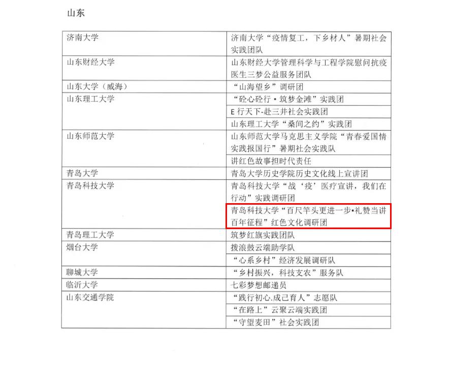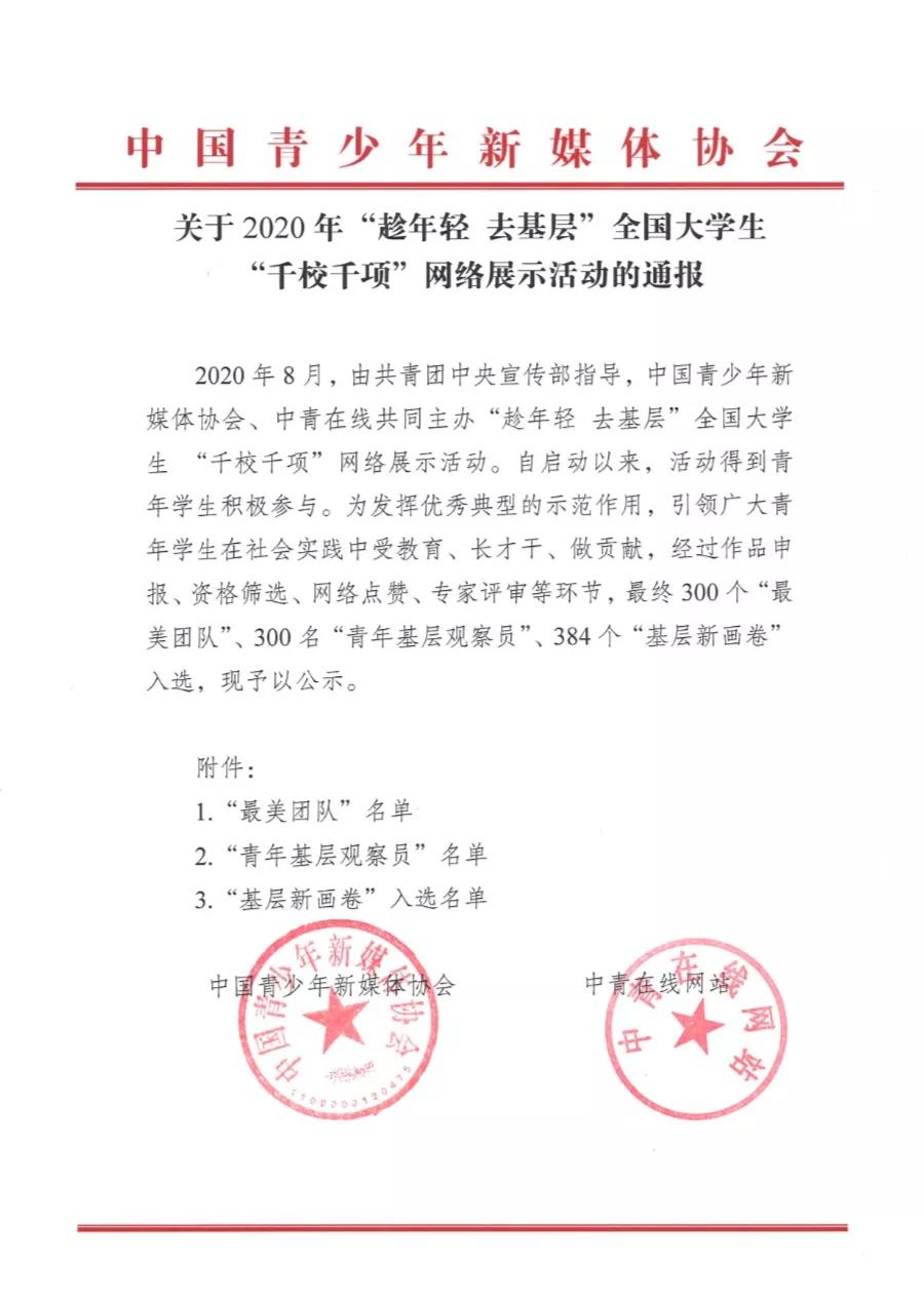 近日,由共青团中央宣传部指导,中国青少年新媒体协会、中青在线共同主办的“趁年轻 去基层”全国大学生“千校千项”网络展示活动顺利举行。自启动以来活动得到青年学生的积极参与,经过作品申报、资格筛查、网络点赞、专家评审等环节,最终在《关于2020年“趁年轻 去基层”全国大学生“千校千项”网络展示活动的通报》中,电子游戏推荐官网耿宇轩同学带领的青岛科技大学“百尺竿头更进一步·礼赞党建百年征程”红色文化调研团获评此次活动“最美团队”荣誉称号。