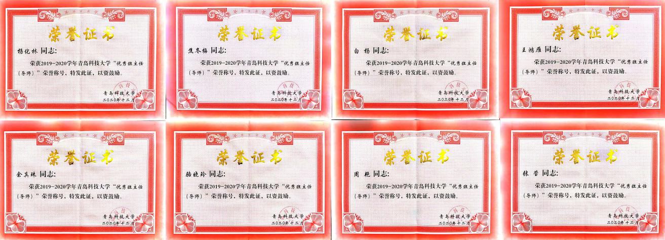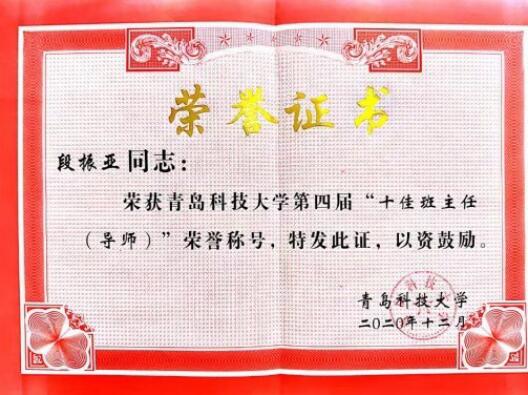 根据《青岛科技大学十佳班主任(导师)评选办法》(青科大学字〔2014〕30号)相关规定,结合2018-2019学年、2019-2020学年班主任考核结果,经学院推荐,学生评议、网络投票和学校评审,学校共评选出十佳班主任10名、优秀班主任(导师)80名。其中,电子游戏推荐官网段振亚老师荣获青岛科技大学第四届“十佳班主任(导师)”荣誉称号;杨化林、焦冬梅、白杨、王鸿雁、余真珠、骆晓玲、周艳、张莹八名老师荣获青岛科技大学“优秀班主任(导师)”荣誉称号。
