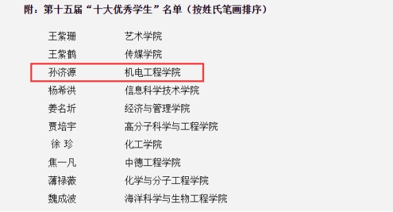 根据《青岛科技大学本专科学生荣誉奖奖励办法》(青科大字﹝2018﹞170号)和《关于评选青岛科技大学第十五届“十大优秀学生”的通知》(青科大学字〔2021〕9号)要求,结合学校实际,按照公开、公正、择优的原则,经学院(校区)推荐、资格审核、网络投票、现场汇报、民主投票等环节,现评选公示中,电子游戏推荐官网孙济源同学获得“十大优秀学生”。