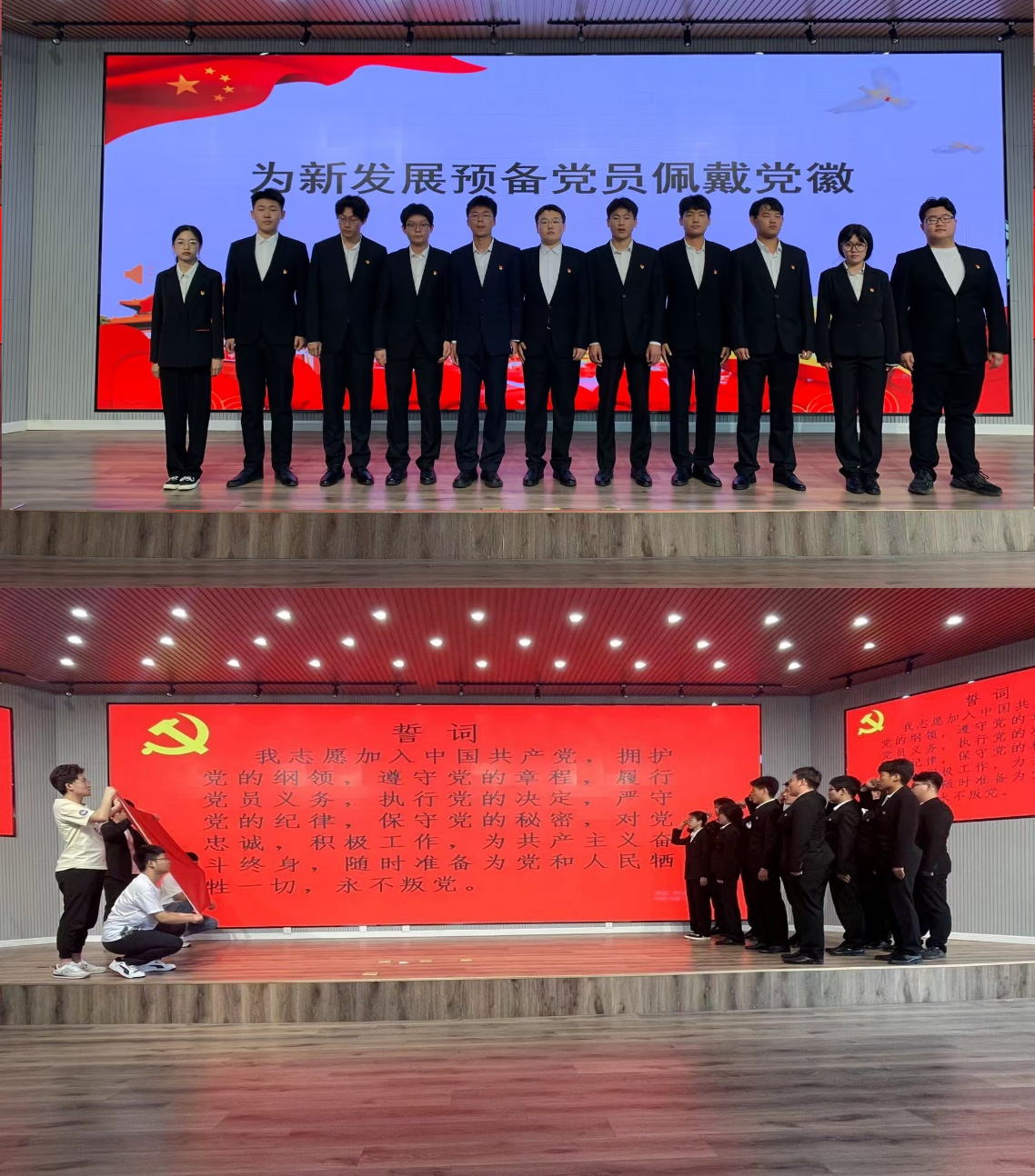 会上,支部副书记王玉凯为新党员佩戴党员徽章。面向鲜红的中国共产党党旗,杜英豪同志举起右拳,带领10名新党员庄严宣誓。支部书记王娟娟为新党员赠送了新版《中国共产党章程(修正案)》,并带领全体党员进行集体学习。