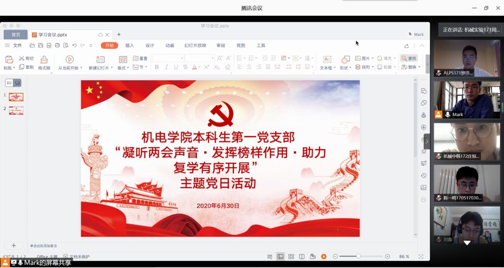本科生第一党支部召开“凝听两会声音·发挥榜样作用·助力复学有序开展”主题党日活动。本科生第一党支部全体党员参会,会议由党支部王玉凯老师主持。