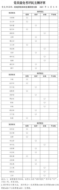 根据《中共青岛科技大学委员会党员量化考评指导办法(试行)》要求,2021年1月5日,电子游戏推荐 本科生第四党支部按照文件要求进行了民主评议党员,现将评议结果公示如下:
