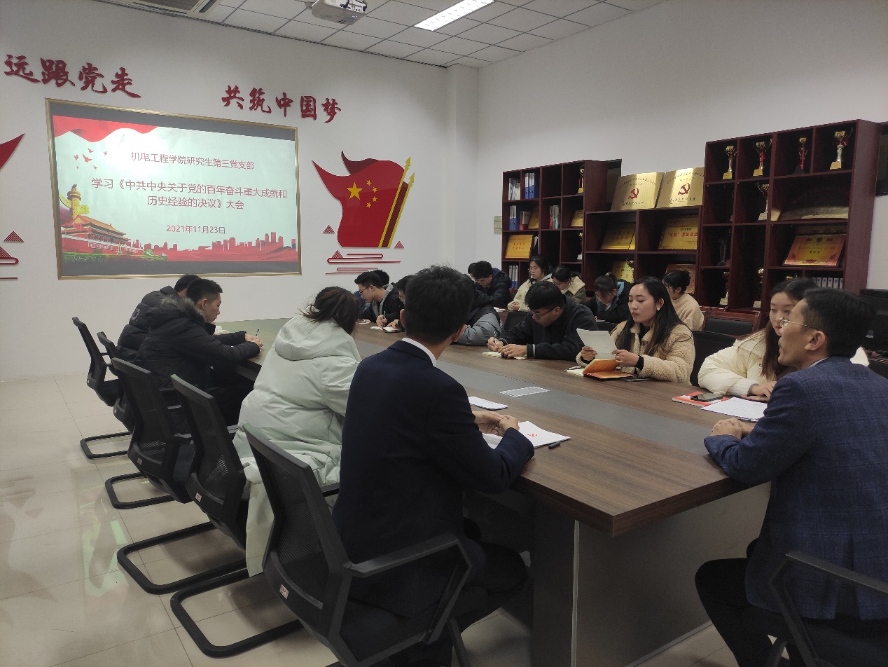 11月23日下午,研究生第三党支部在机电楼529召开学习《中共中央关于党的百年奋斗重大成就和历史经验的决议》大会。全体党员共同学习《中共中央关于党的百年奋斗重大成就和历史经验的决议》有关内容。