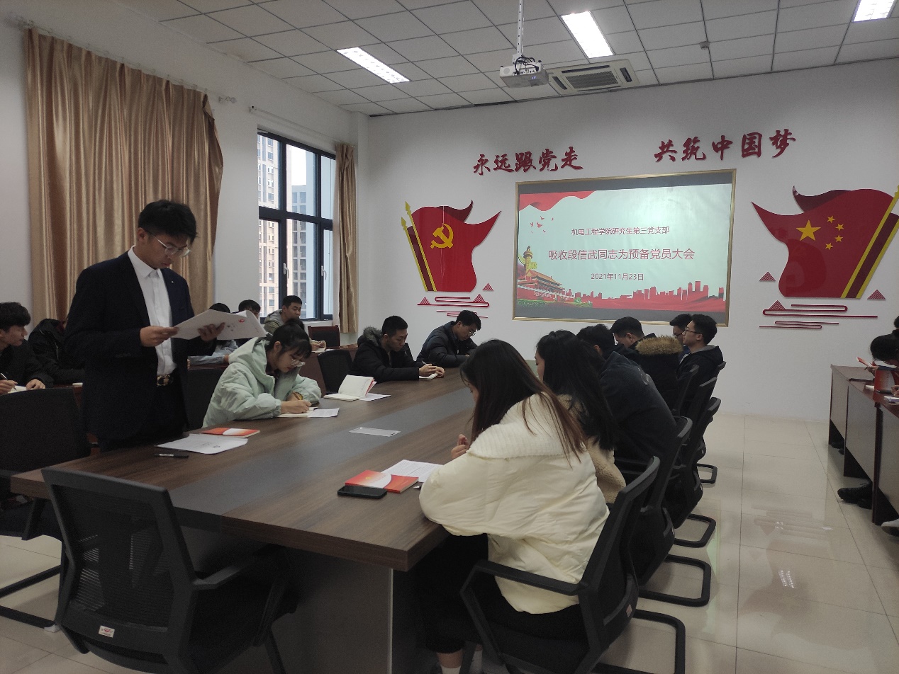 研究生第三党支部在机电楼529会议室召开预备党员转正大会,支部党员全员参加会议,会议由宗萌主持。