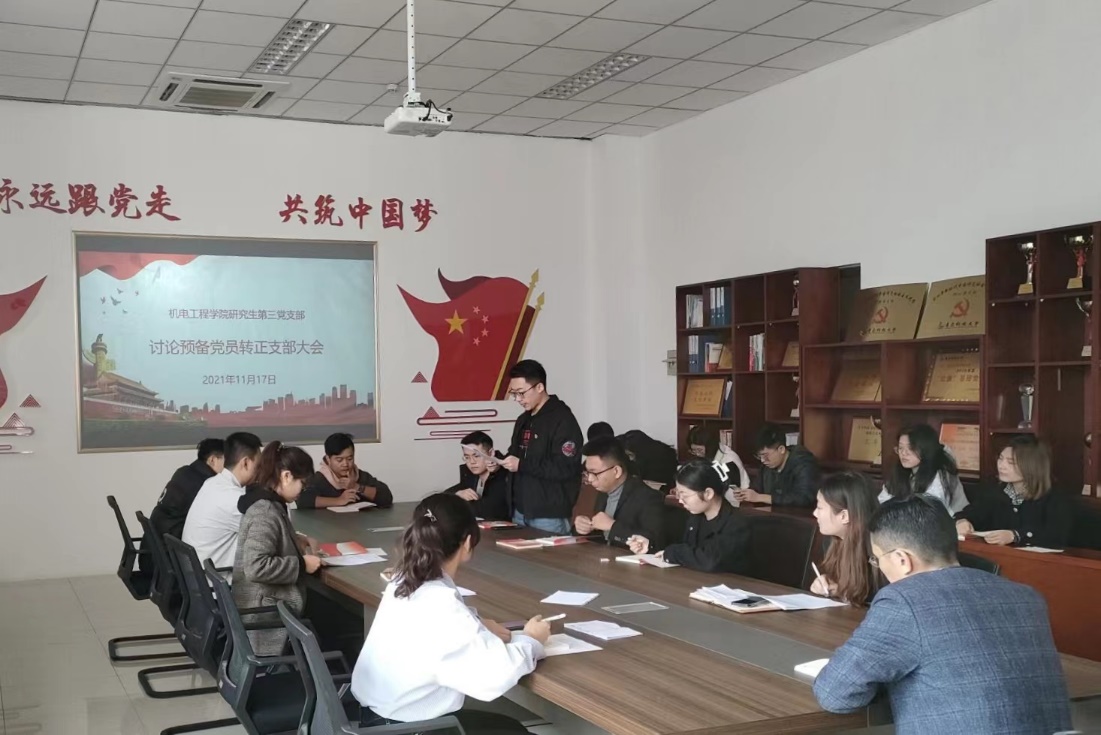 研究生第三党支部在机电楼529会议室召开预备党员转正大会,支部党员除一人请假外其他人员参加会议,会议由宗萌主持。