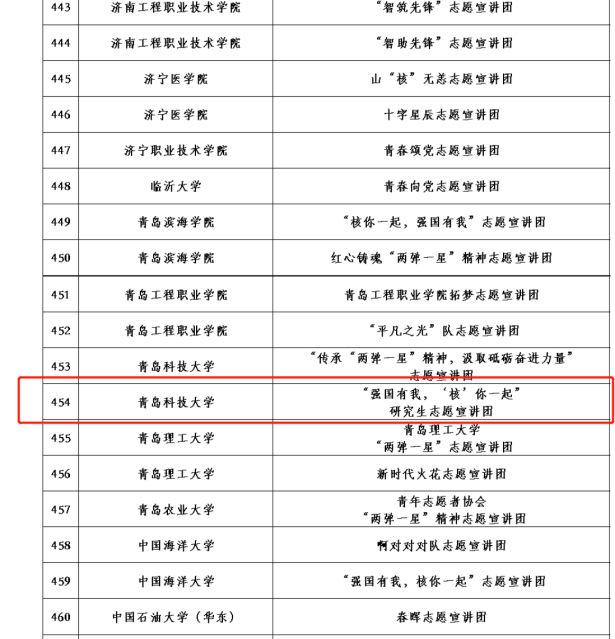 近日,团中央青年志愿者行动指导中心公布2023年全国大学生“两弹一星”精神志愿宣讲团、“防治结核 志愿有我”志愿宣讲团、井冈山精神志愿宣讲团、“七彩假期”志愿服务示范队入选名单,青岛科技大学共11支团队入选,其中电子游戏推荐