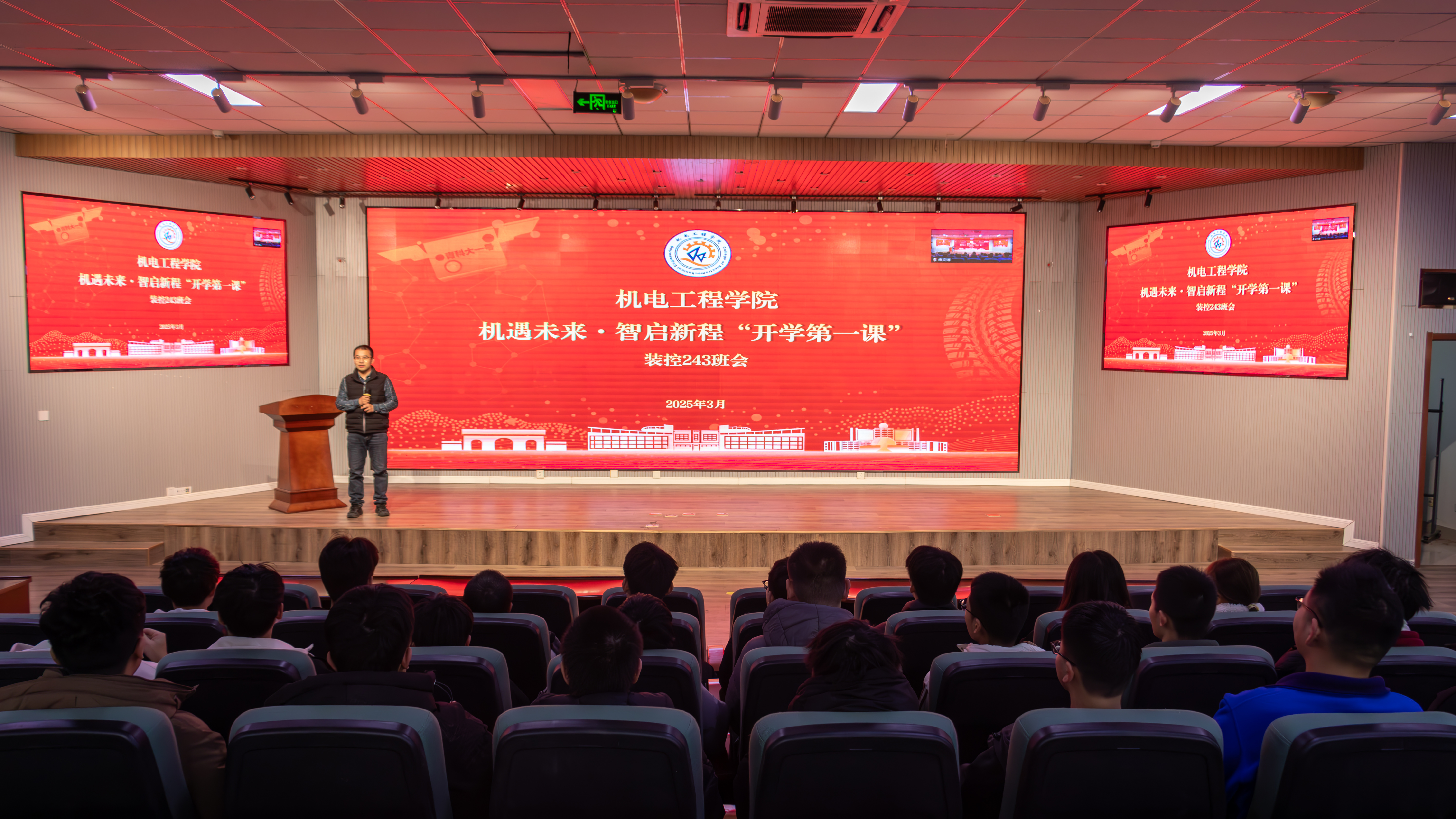 在D3-530会议室开展“机遇未来·智启新程——开学第一课”主题班会示范课。学院党委副书记兼副院长杨小明、装控243班班主任秦楠、装控243班全体同学参加线下主题班会,学院80余名班主任线上线下观看主题班会示范课。辅导员周韫涵主持示范课。