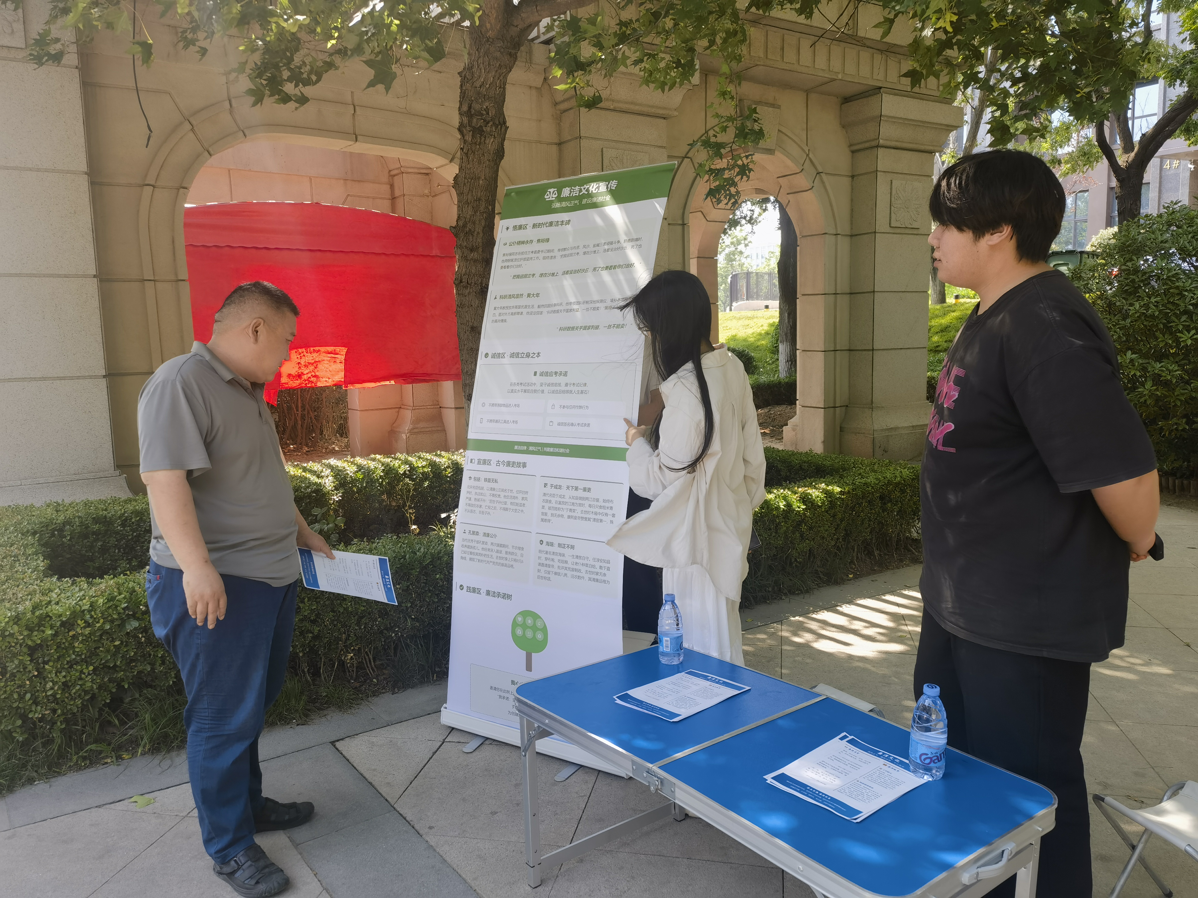 随后,志愿者们在校门口向过往师生发放传单,志愿者们结合校园生活实际,与同学们探讨宣传廉洁,有人分享“班会选举时学生干部主动回避亲属投票”的身边事例,有人分享“考试诚信是治学底线”的感悟,形成热烈的廉洁理念交流氛围。