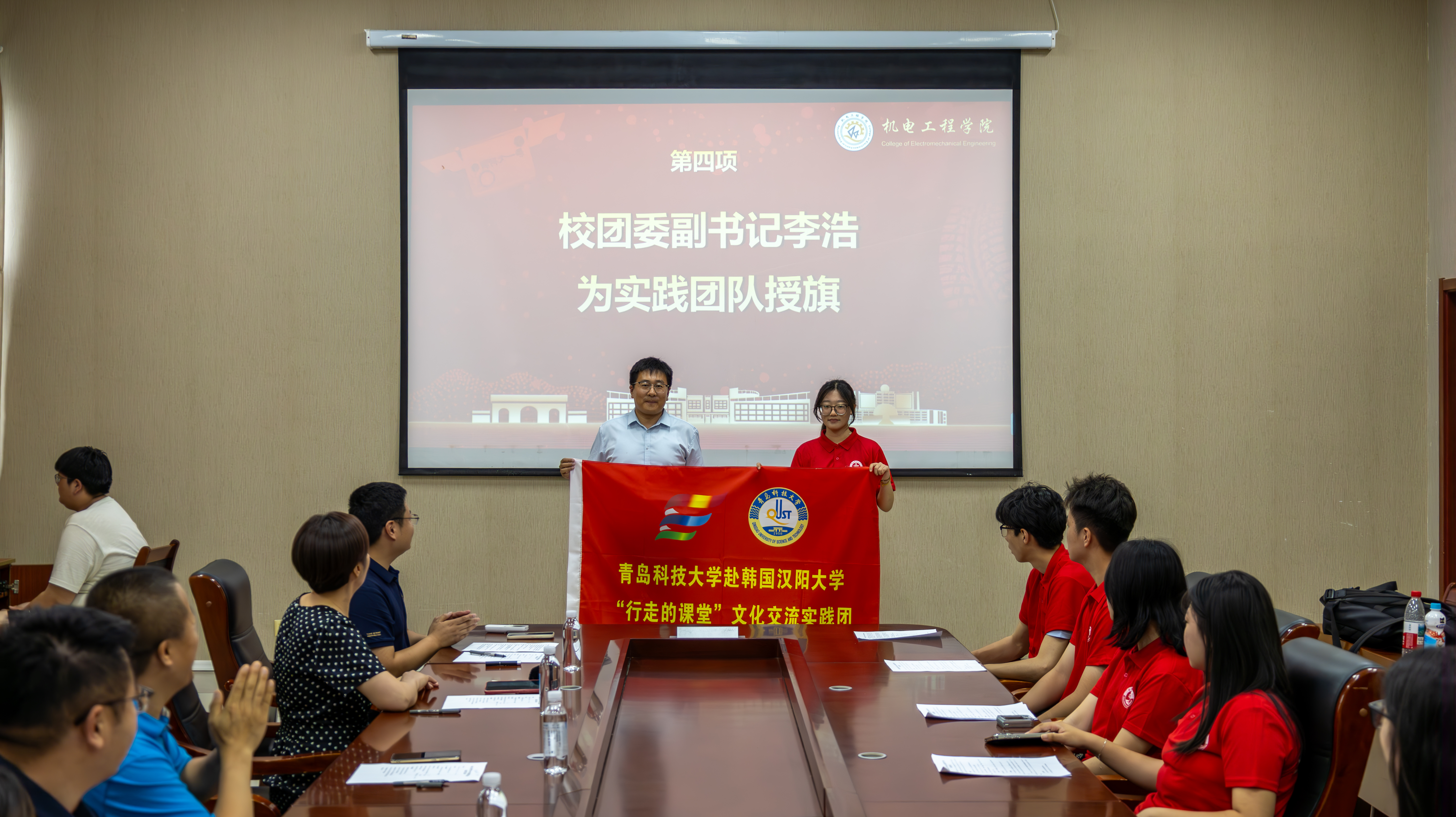 2025年赴韩国社会实践出征仪式在D3-518会议室举行。校团委副书记李浩、学院党委副书记兼副院长杨小明、国际交流合作处涉外办学管理科科长邱南南、学院团委辅导员老师及学生代表参加活动。