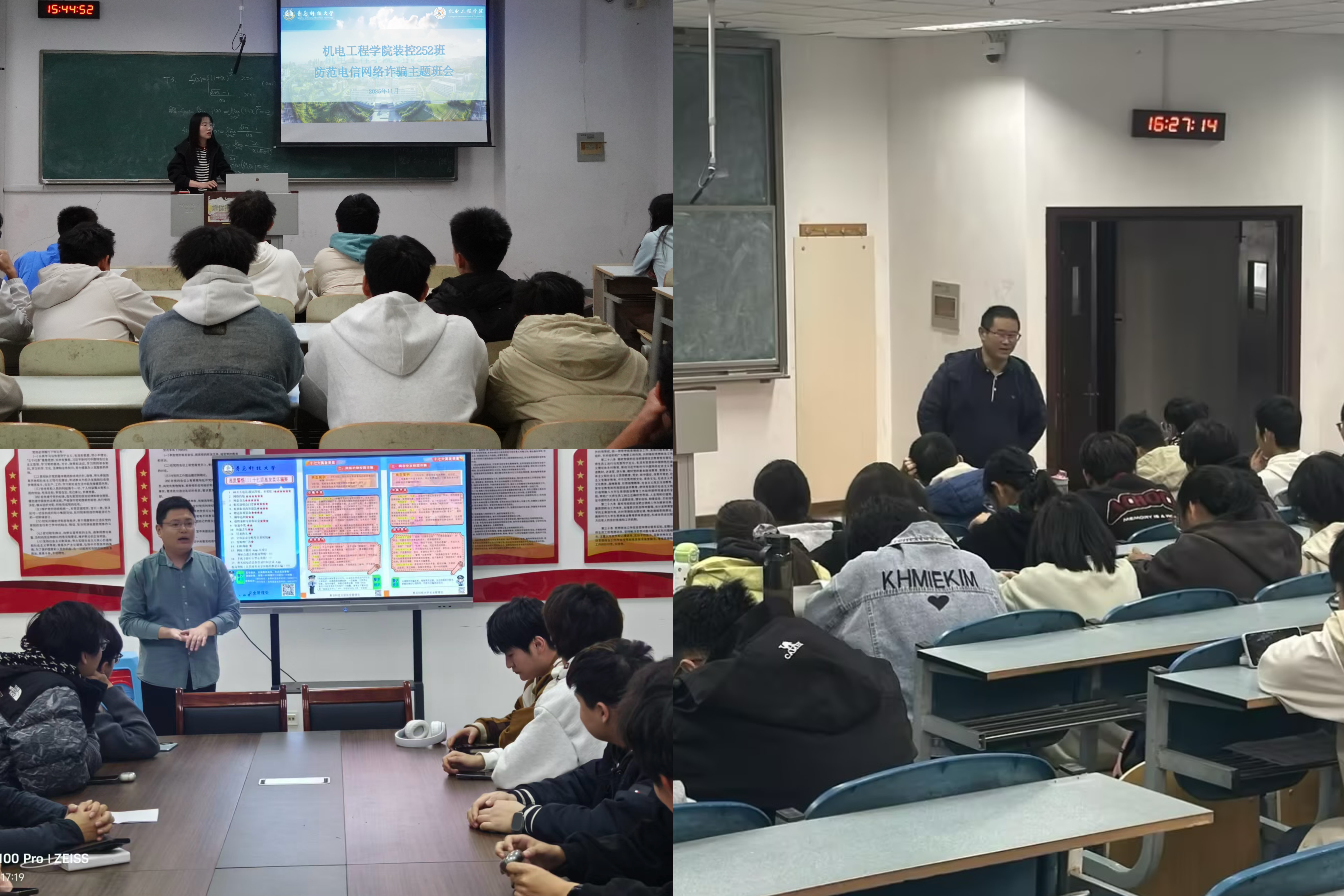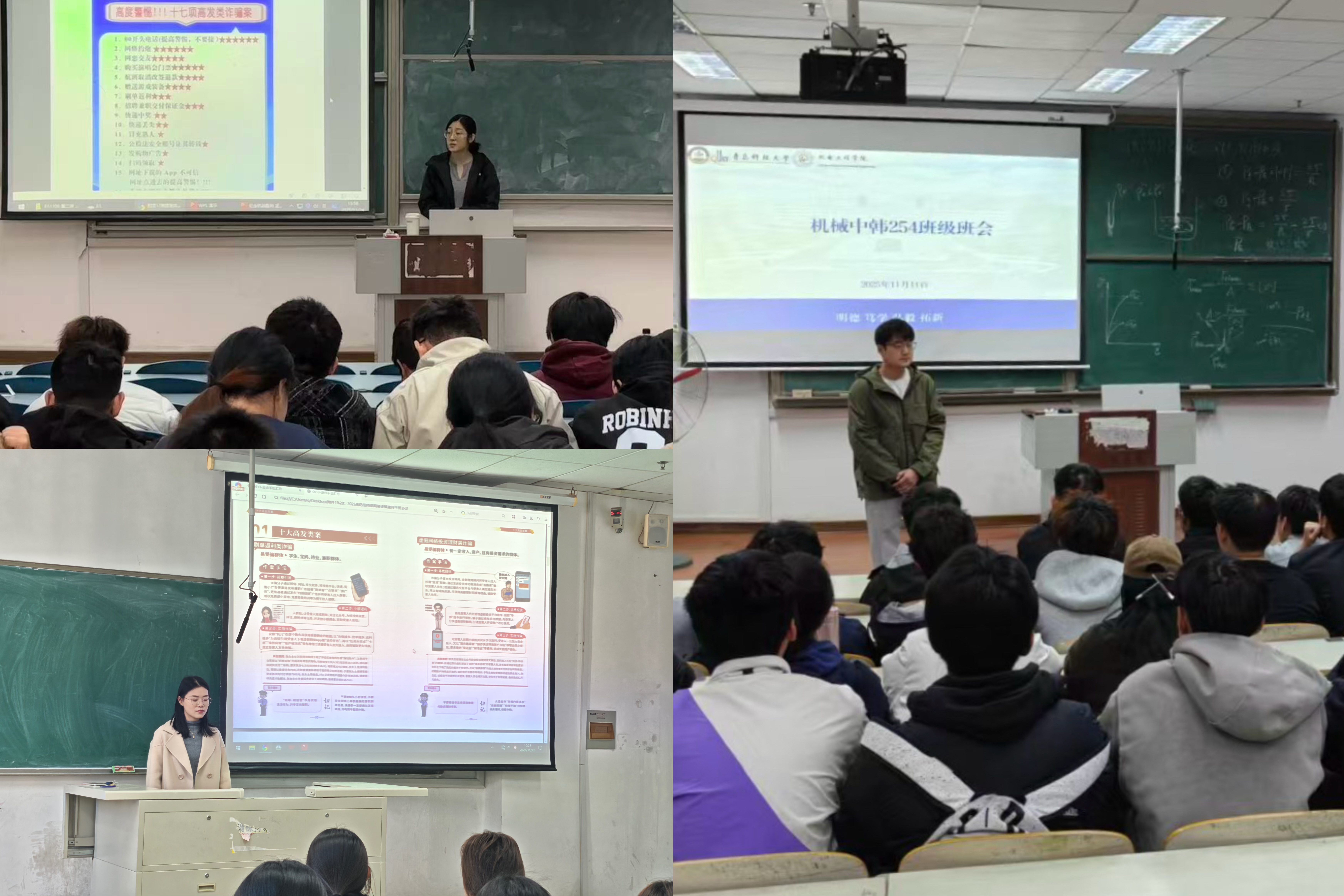 持续深入开展“防范电信网络诈骗,共筑平安和谐校园”为主题的安全教育班会,深入学习青岛科技大学印发的《17项高发类诈骗案》学习资料和11月份班主任班会指南。主题班会由各班班主任主持,各班级全体学生参加。
