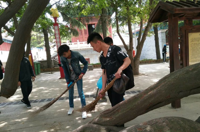 青尘义工队队员前往湛山寺进行卫生清理工作。在湛山寺门口,义工队员与一同参加活动的青岛大学青峰义工队、小学生义工队集合并进行各队自我介绍和任务分配。