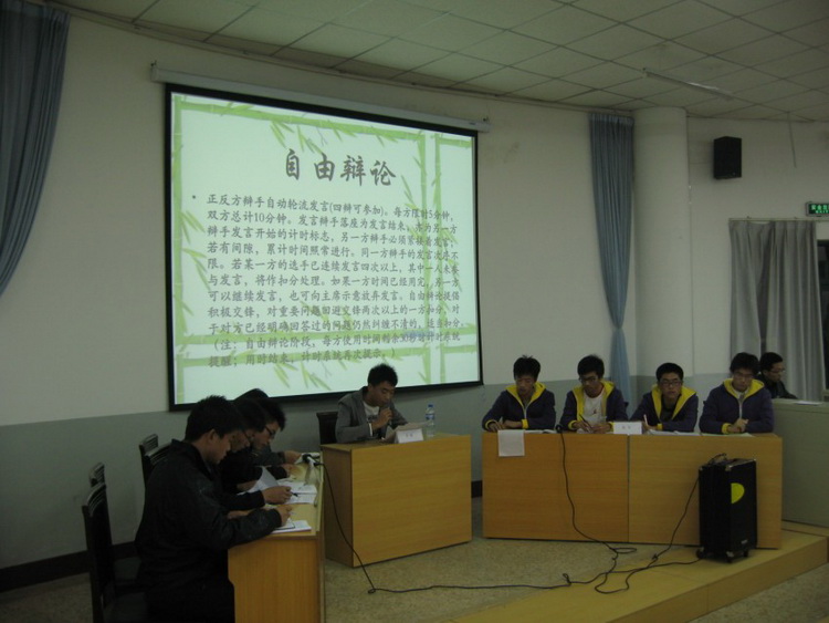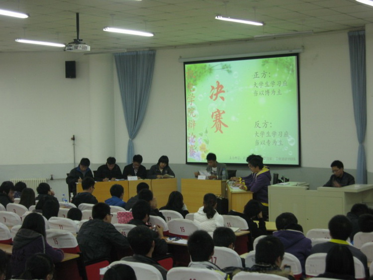 本次辩论赛历时近二十天,经过初赛、复赛激烈角逐,辩论三队和辩论五队进入今天的决赛。双方辩手围绕辩题“大学生学习应该以博为主还是以专为主”展开激烈辩论。在自由陈词阶段,双方辩手妙语连珠,引经据典,大量的事实论据令评委和观众惊叹不已,台下不时传来阵阵掌声和喝彩声。自由辩论阶段,反方辩手牢牢抓住大学学习应该以专为主,以博为辅展开攻势,从当代大学分专业说到当今社会分工的细化,从古代的达尔文说到近代的胡适;正方也毫不示弱,针锋相对的指出社会分工细化更突出了社会整合性的需求,以现代社会更需要的是整体性思维,宏观性把握予以反击。观众提问环节,同学们纷纷举手提问,智慧的灵光不时闪现。现场气氛十分热烈,场上高潮不断,观众们在欣赏比赛的同时也深深感受到辩手们思维的敏捷,口头表达的流畅。最后,辅导员老师秦洪庆做精彩点评。经过激烈的辩论,凭借出色的表现,来自高机114班的李高林同学获得本次年级辩论赛的最佳辩手,机自111班齐忠凯、机自111班楚亚松、工业设计113班荆鹏超获得优秀辩手。由机自111班、工设113班、过控114班组成的辩论5队获得比赛冠军,由船舶111、高机114、过控111组成的辩论3队获得亚军。与会的评委老师为获奖的班级和个人颁发证书、奖状和奖品。