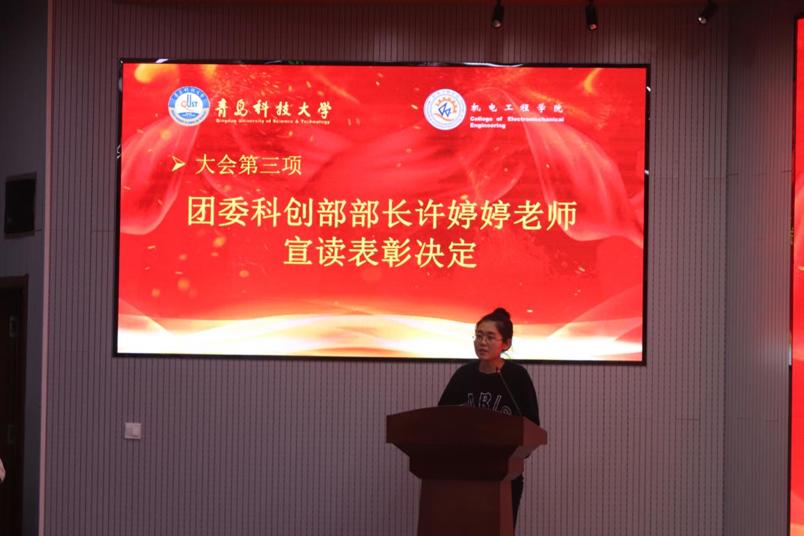 志工部副部长樊庆洋从志愿服务的活动开展、创新形式、宣传效果三个方面作了工作汇报,志工部部长兼指导老师胡福超老师对志愿服务工作的开展和取得成果表示肯定和祝贺,并在志愿服务信念、工作、学习三方面对志愿者们提出了新的要求。团委科创部部长兼指导老师许婷婷老师宣读表彰决定并同胡老师一起为受表彰人员颁奖。