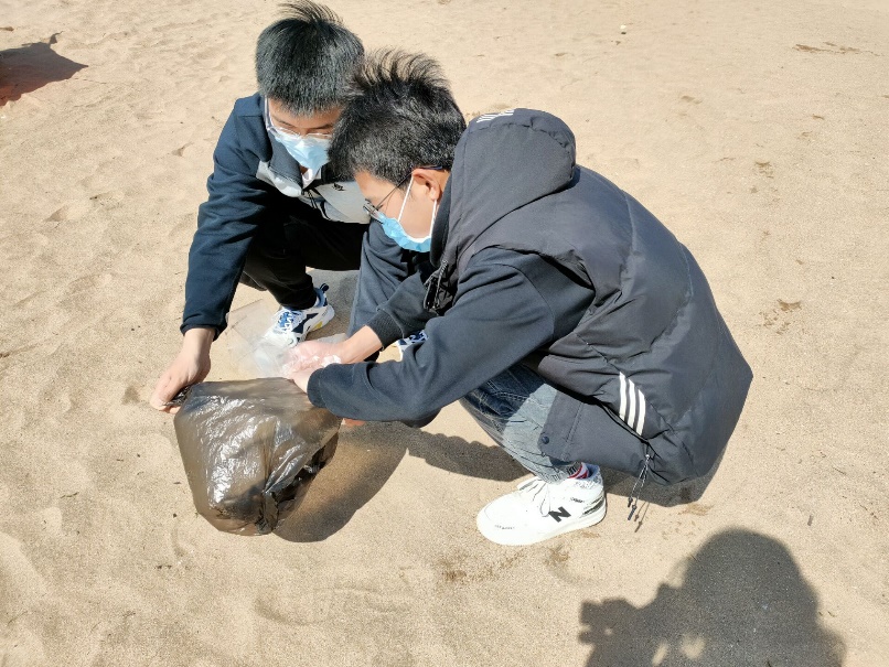 活动当天,碧海蓝天,清风拂过,在游人如织的沙滩上,志愿者们不怕脏,不怕累,身穿红色的院服,手拿垃圾袋,二至三人一组,对沙滩上的烟头、塑料袋、玻璃、石头等不可降解的垃圾和危险废弃物进行地毯式的搜索。经过一个小时的认真清理,同学们收获了满满的“战利品”,石老人的海滩也焕然一新,再次呈现出干净整洁的海岸风光。