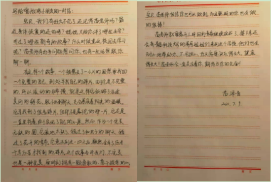 第22届研究生支教团新疆兵团志愿者苗泽青返青后,在深夜给曾怡鸿小朋友和姥姥写了一封信,信中给她讲了一个小故事,为了能够更好的帮助曾怡鸿小朋友的学习成长,苗泽青也将爱心的接力棒传递给了第23届研究生支教团成员,接续奋斗。