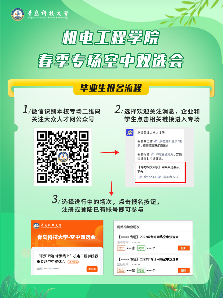 手机微信扫码关注“大众人才网”微信公众号,企业和毕业生分别点击相关按钮进入青岛科技大学专场,点击本学院报名按钮,注册或登录已有账号即可直接参与。